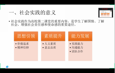 7月6日,陆芳以《暑期社会实践策划与开展》为题,阐述了社会实践的开展过程,她从“选题”、“分工”、“记录、宣传”、“调研方法”、“调研报告”、“优秀案例”、“实践报告撰写”、“社会实践活动评选”等八个流程探讨社会实践的策划与开展。她强调,社会实践不但选题要深入,充满人文关怀,而且要注重团队的分工协作,同时做好纸质、电子记录,加强线上、线下宣传作用,并且结合自己的专业背景,运用多元化又与内容契合的调研方法完成调研报告。