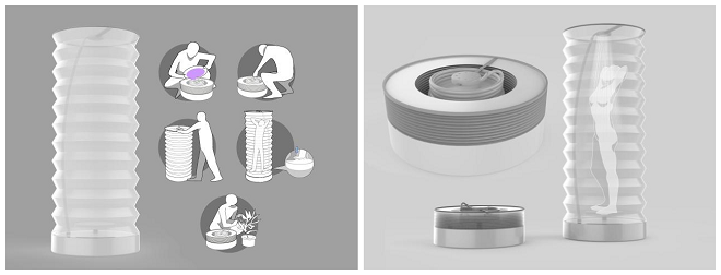 设计说明:联合国粮农组织发布的《2020年粮食及农业状况》报告称,当前全球32亿人口面临水资源短缺问题。受人口增长、污染以及气候变化等因素影响,全球水资源短缺压力不断增大。据统计,过去20年间,全球人均淡水供给量减少20%以上。水资源匮乏,生活用水拮据,使得贫困地区的环境十分糟糕,再加上气候影响,十分容易滋生细菌。在这样的条件下,洗澡成为一件极度奢侈的事情。许多贫困地区的人们无论男人女人只能露天在河边打盆水往身上一浇,没有任何遮蔽,使用的水源也十分不卫生,容易滋生细菌,产生疾病。E-SHOWER是一款简便的的淋浴装置,可以帮助贫困地区的人们方便快捷地搭建一个洗浴空间,并能够对洗澡水进行简单的过滤。使用前将水注入装置底部的水箱,然后将折叠罩拉起固定,形成一个封闭的淋浴空间,保证淋浴过程的私密性。使用时通过反复踩压水泵将过滤后的洁净水源通过压力输送到淋浴喷头。淋浴时,装置底部会再次将淋浴水收集起来进行过滤并再次循环;淋浴完成后,水箱内储存的水经再次过滤可以用来浇花等,最大化实现水资源的再利用。