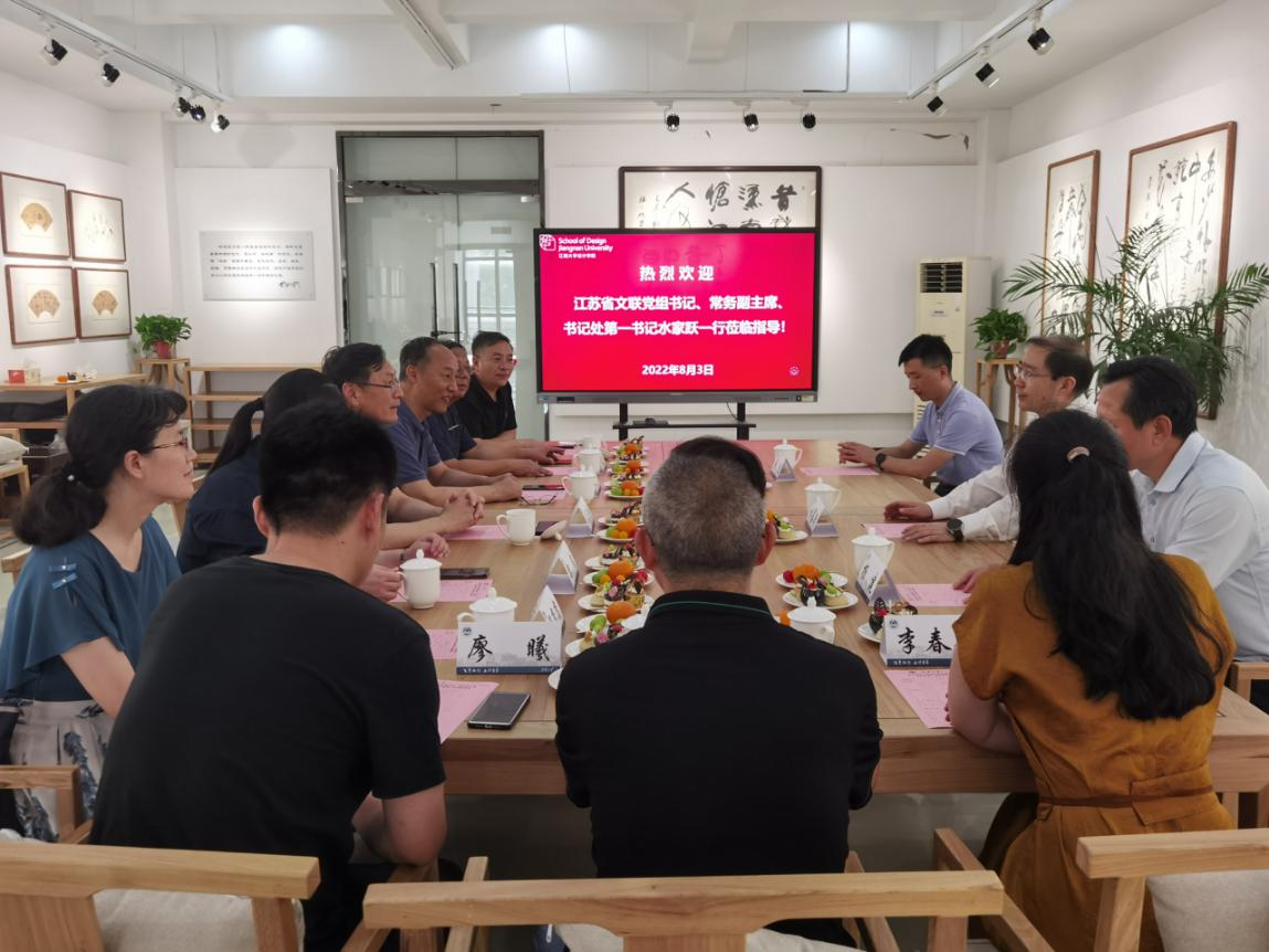 8月3日下午,江苏省文联党组书记、常务副主席、书记处第一书记水家跃一行到江南大学考察指导,无锡市文联党组书记、主席杨建、无锡市民间文艺家协会驻会副秘书长阚波陪同考察;校党委常委、副校长吴正国、校党委常委、党委办公室主任朱飞、体育博彩网站