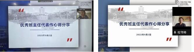 优秀班主任代表吴祐昕老师、杜守帅老师受邀做了经验分享,一流学科课任教师崔和平受邀发表了班主任任职感言。