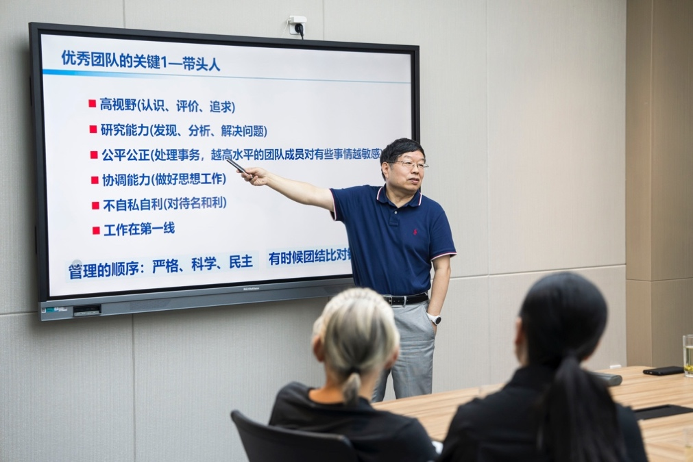 陈坚院士首先带领大家参观了研究院的实验室、办公环境,介绍了研究院成立的主要背景和概况。随后,陈坚院士就如何建设优秀的团队做了《知行合一守正创新》的专题分享。陈坚院士介绍,宜兴研究院针对主要研究方向引进了以江南大学为主的十余个独立研发团队,包括高校教授团队和企业研发团队,形成以中国工程院院士、教育部长江学者特聘教授、国家杰出青年基金获得者、国家“万人计划”科技创新领军人才以及青年学术骨干为中坚力量的人才队伍。关于团队建设的思考,陈坚院士从团队建设的重要性、优秀团队的特点、优秀团队的关键等方面进行了深入的分享。