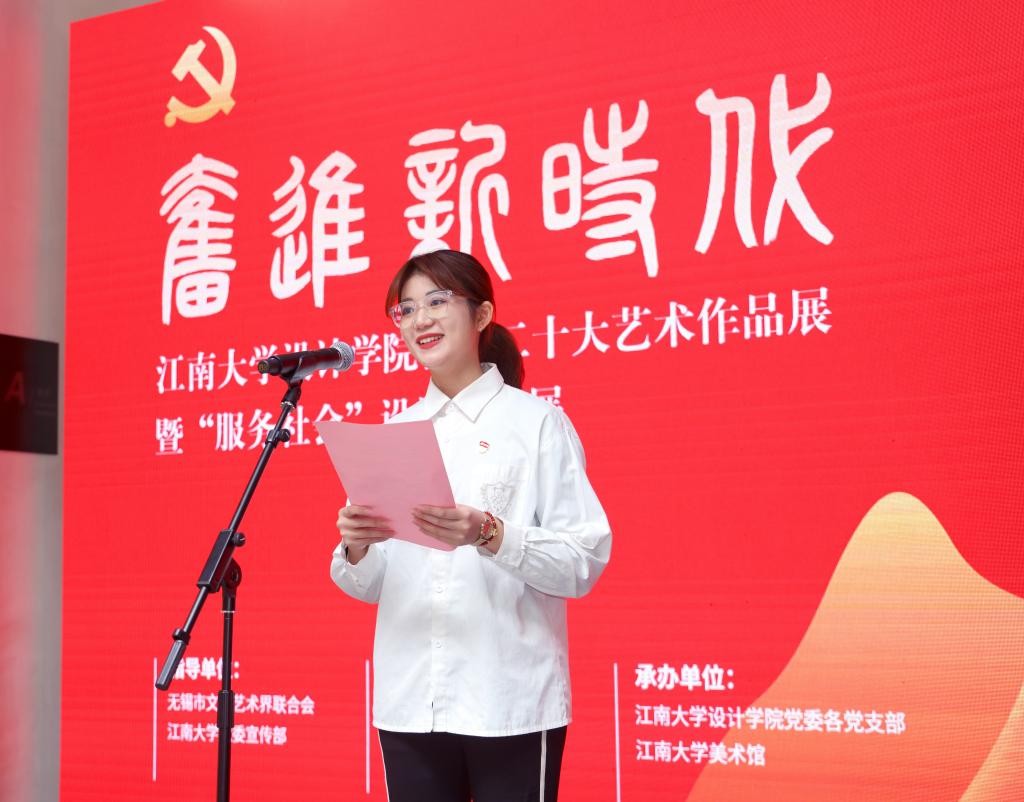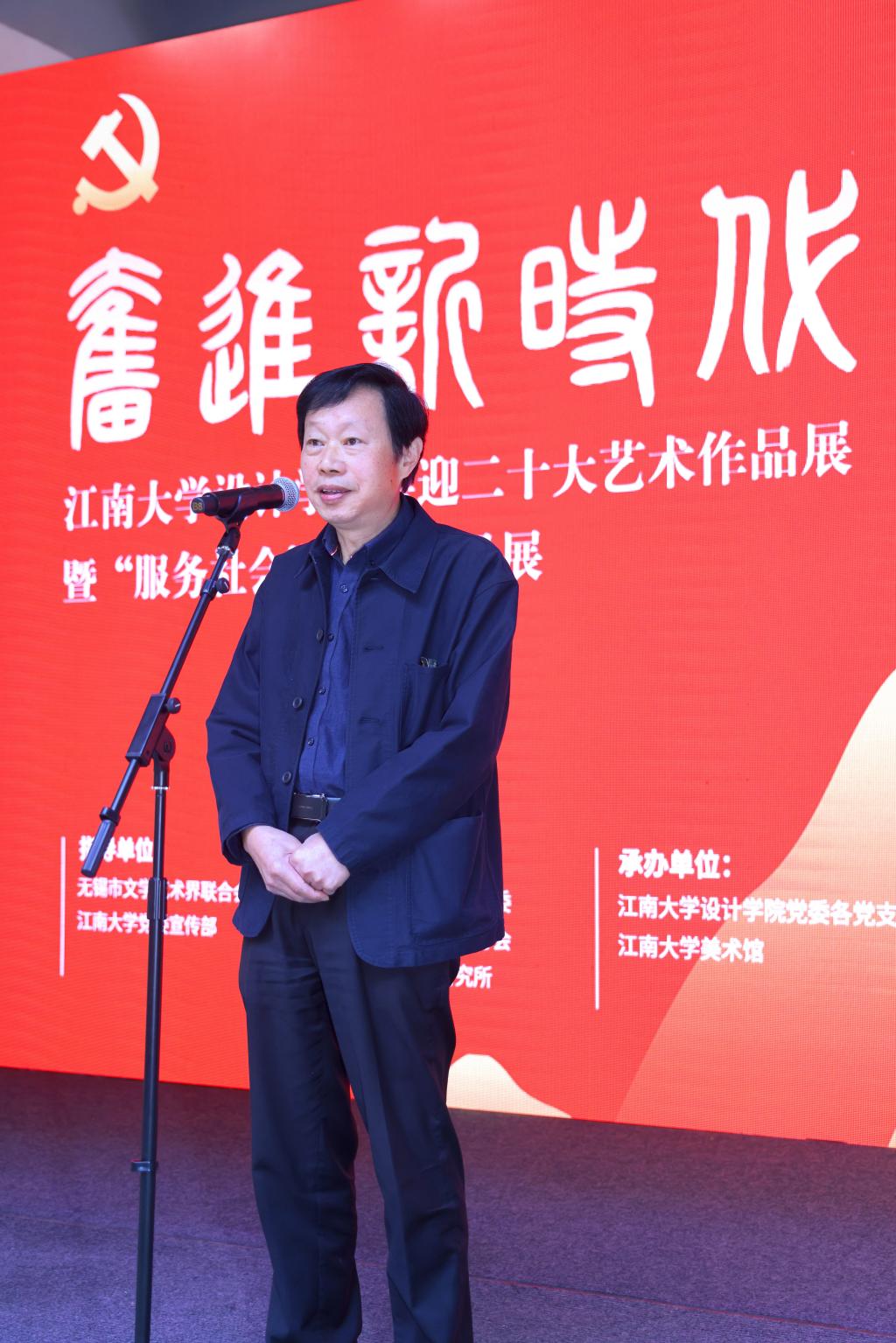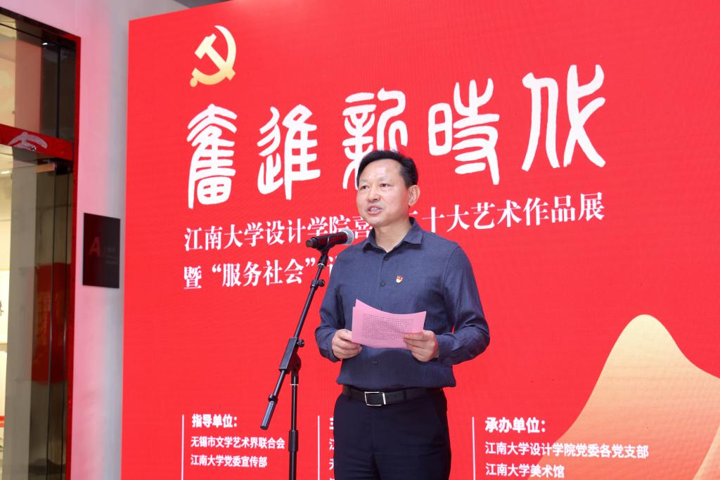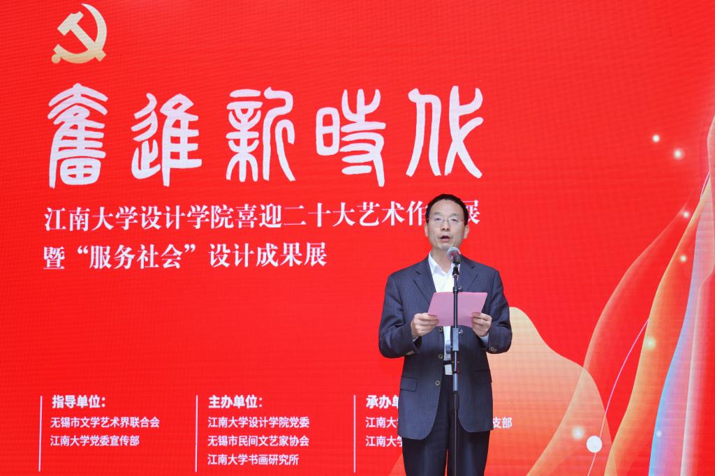 喜迎二十大艺术作品展暨“服务社会”设计成果开幕式于江南大学美术馆举行。江南大学党委常委、副校长堵国成,无锡市文联党组书记、主席杨建,江南大学党委组织部常务副部长方正泉,江南大学体育博彩网站