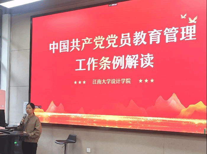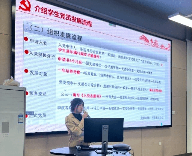 党建辅导员滕影为与会人员详细介绍江南大学学生党员发展的流程。她以发展时间节点为主线认真讲解了申请入党、入党积极分子、发展对象、预备党员和正式党员等五个部分的流程和要点,重点强调了党支部在各个环节中的作用以及需要承担的工作内容,各部分材料的书写规范以及需要注意的问题,并详细介绍了江苏省大学生党员发展工作“三投票三公示一答辩”的实施办法,希望各支部在党员发展的各个环节中能够严格遵守“十六字”总要求和各项规章制度,做到公平公正公开,提高发展工作科学性和公信度,把真正优秀的积极分子吸纳到党组织中来。