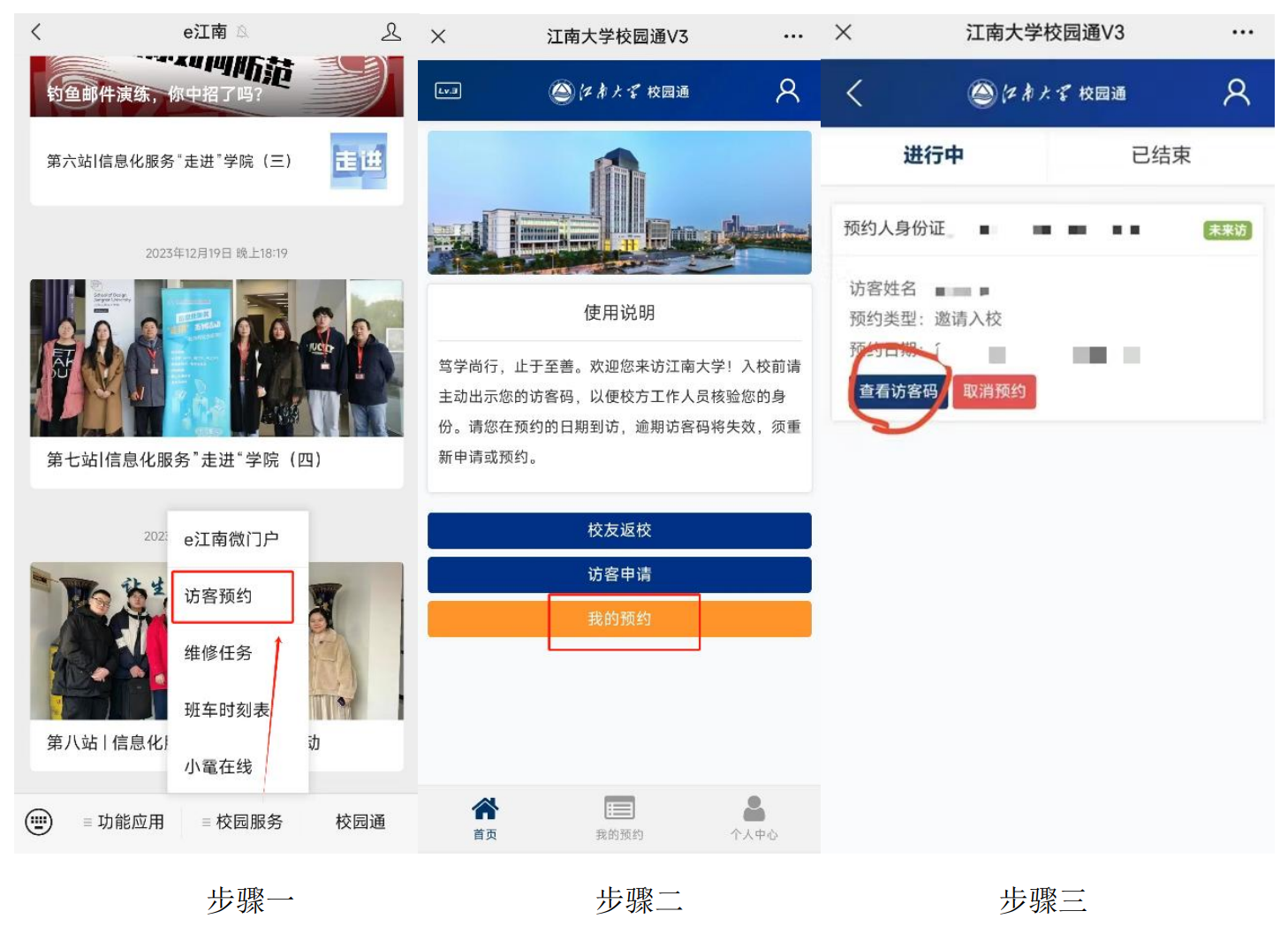 手机关注“e江南”微信公众号,点击屏幕下方“校园服务”中的“访客预约”,进入后点击“我的预约”,点击“查看访客码”即可获得访客码。进入校园时出示访客码。