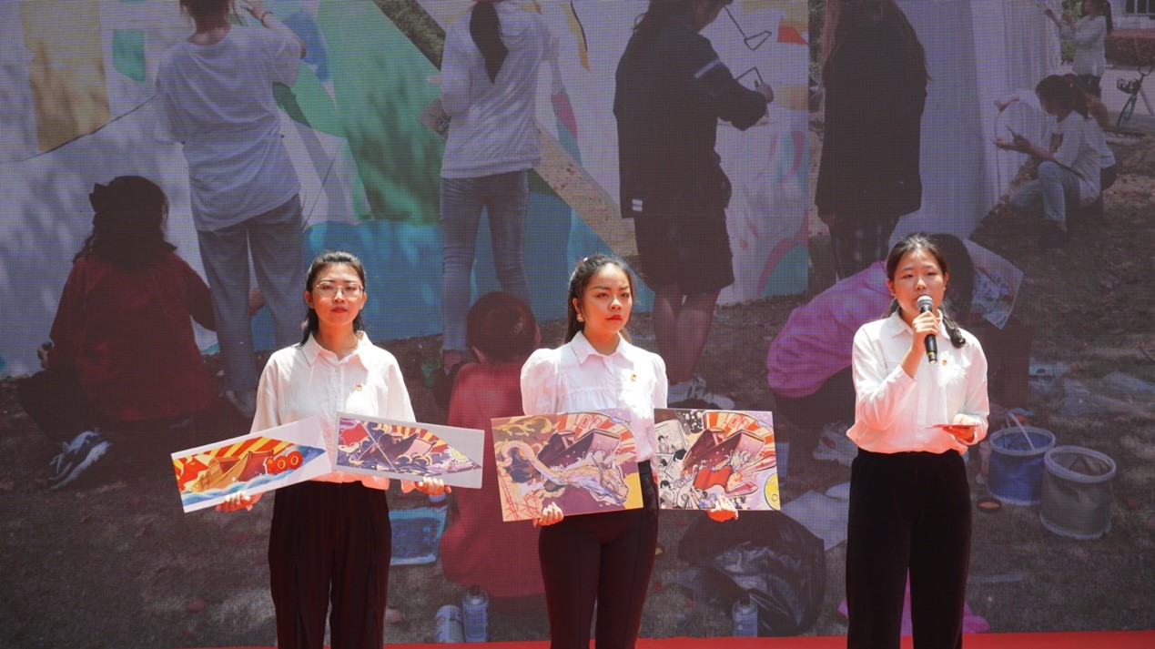 随后,墙绘设计指导老师代表,公共艺术与美术系原党支部书记徐晴副教授和视传2003班学生代表郭慧蕾同学分别进行“百年红墙”主题墙绘项目介绍,分享了“百年红墙”的创作思路和创作历程。