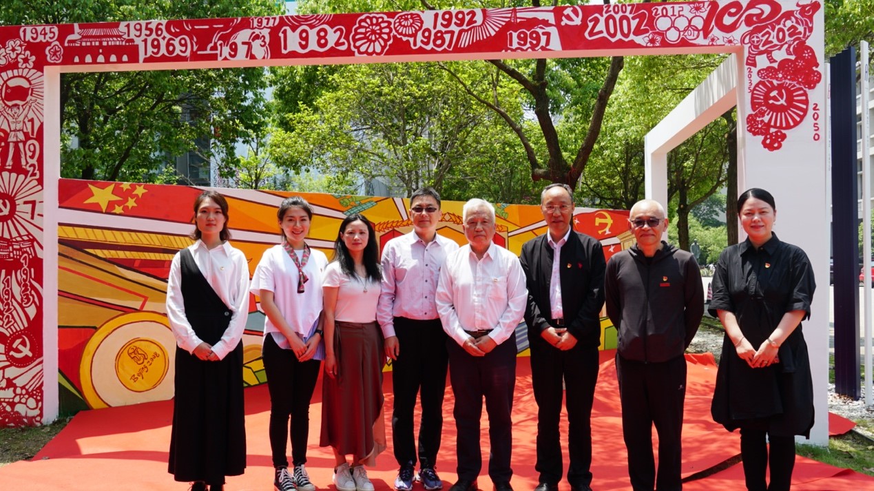 “永远跟党走——师生同绘百年红墙”揭幕仪式在学院“百年红墙”广场举行,校党委常委、组织部部长张影陆,校党委常委、党委办公室主任、统战部部长朱飞,无锡博物院党总支书记肖炜,体育博彩网站