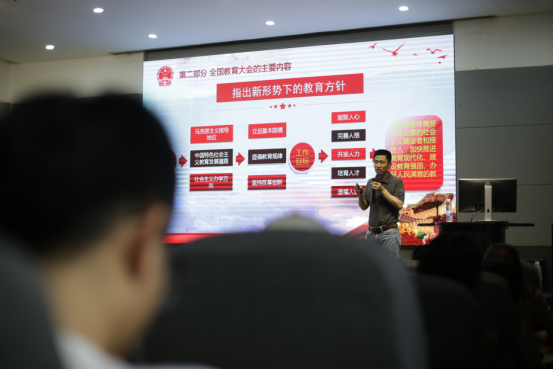 戴月波从最近的热点话题“中美贸易战”切入,引出“不忘初心铸伟业—聚焦全国教育大会宣讲”的主题。他强调,以习近平同志为核心的党中央情系教育事业发展、关注青年人才培养。通过带领同学们回顾改革开放以来党中央、国务院召开的四次全国教育工作会议,戴月波指出每一次全国教育工作会议的召开都是在深入研究当时教育工作面临的形势和任务的前提下对当前和今后一个时期教育改革发展作出的战略部署。随后,他结合2018年全国教育大会,从一个根本任务,一个重要目标,九个坚持,六个下功夫等方面诠释了新时代人才培养体系的新要求、新方向。在谈到深化教育体制改革的问题时,戴月波表示高校不仅要从健全立德树人方面落实机制,扭转不科学的教育评价导向,更要坚决克服唯分数、唯升学、唯文凭、唯论文、唯帽子的“五唯”顽瘴痼疾,从根本上解决教育评价指挥棒问题。在谈到江南大学所面临的教育事业发展状况时,戴月波表示在全国教育事业发展的宏伟蓝图下,江南大学迎来了机遇也面临着挑战。他从拔尖人才教育与培养、工程实践教学与探索、课程体系优化与拓展、研究生选拔与培育、学生海外交流的推进、体育精神培育与推广、学科竞赛工作的改革、勤工助学改革与实践等方面讲解了学校在贯彻落实大会精神,推动内涵式发展方面所做的努力。希望同学们能立足大设计格局,紧紧抓住国家“双一流”建设的重大机遇,立志成为创新型、复合型、应用型的行业中坚人才。